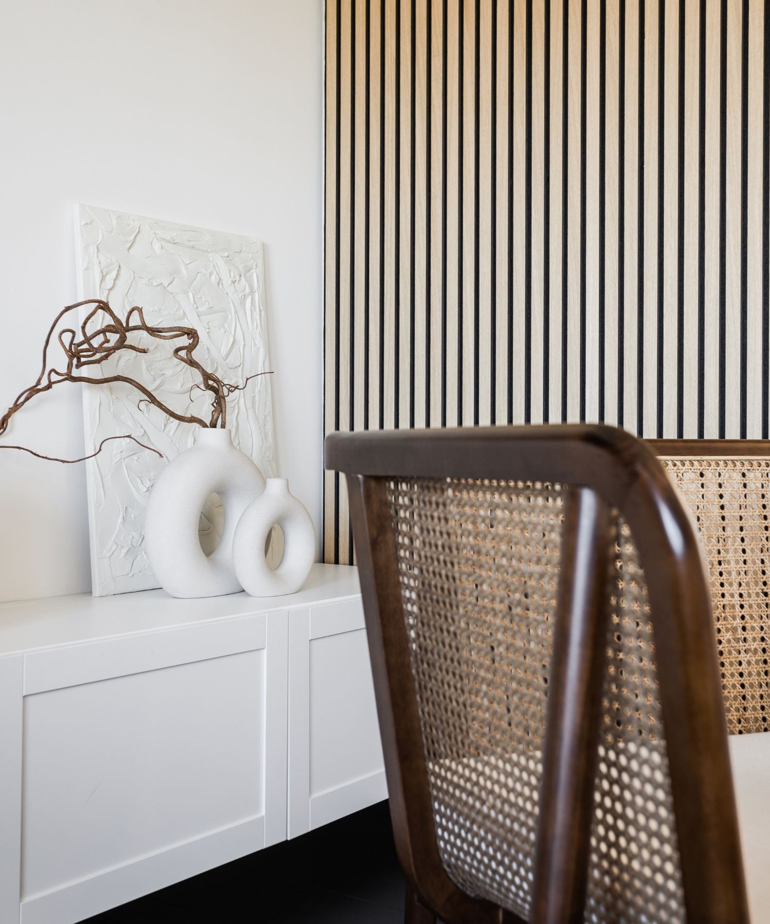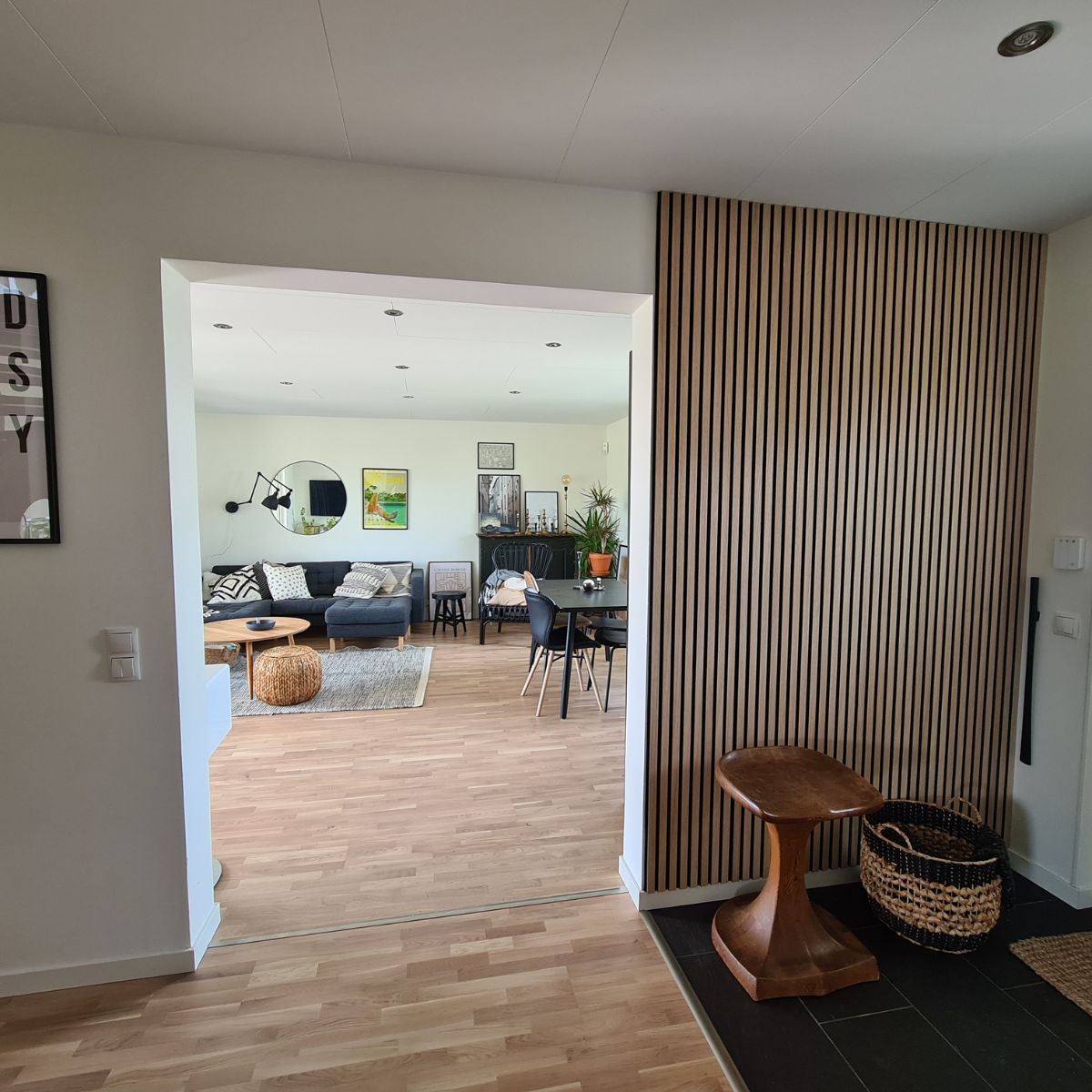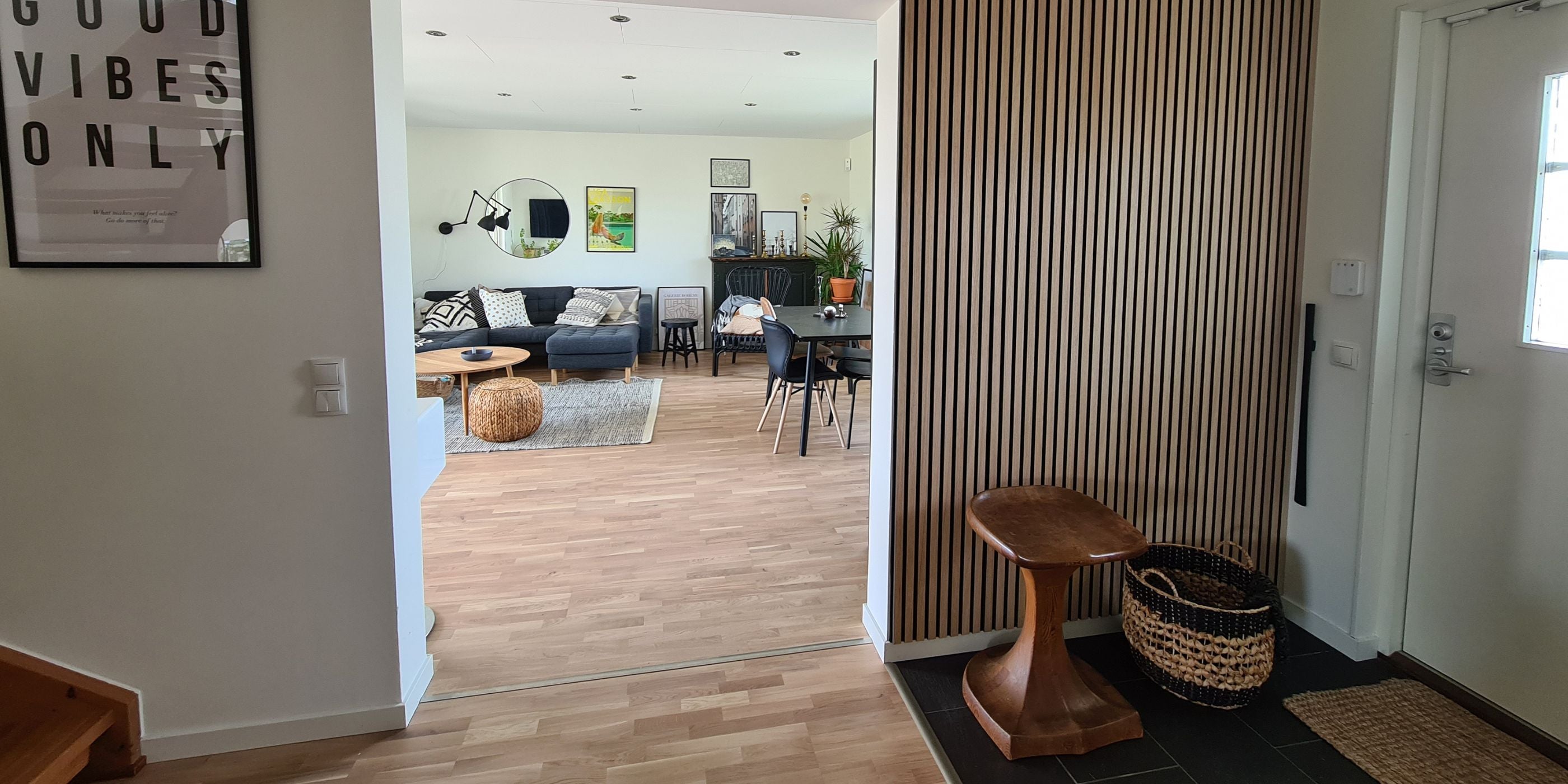 Die Premium-Paneele werden in zwei Standardgrößen hergestellt, 2400x600 mm und 3000x600 mm. Je nachdem, welche Holzart Sie bevorzugen, Eiche oder Nussbaum, können Sie verschiedene Öle wählen, die Sie selbst auf das Produkt auftragen. Dies bietet zum Beispiel die Möglichkeit, das Paneel mit etwas zu kombinieren, das Sie bereits in Ihrem Haus haben. Die Möglichkeit, die Paneele selbst zu ölen, hat den Vorteil, dass Sie mit der Farbe experimentieren können.